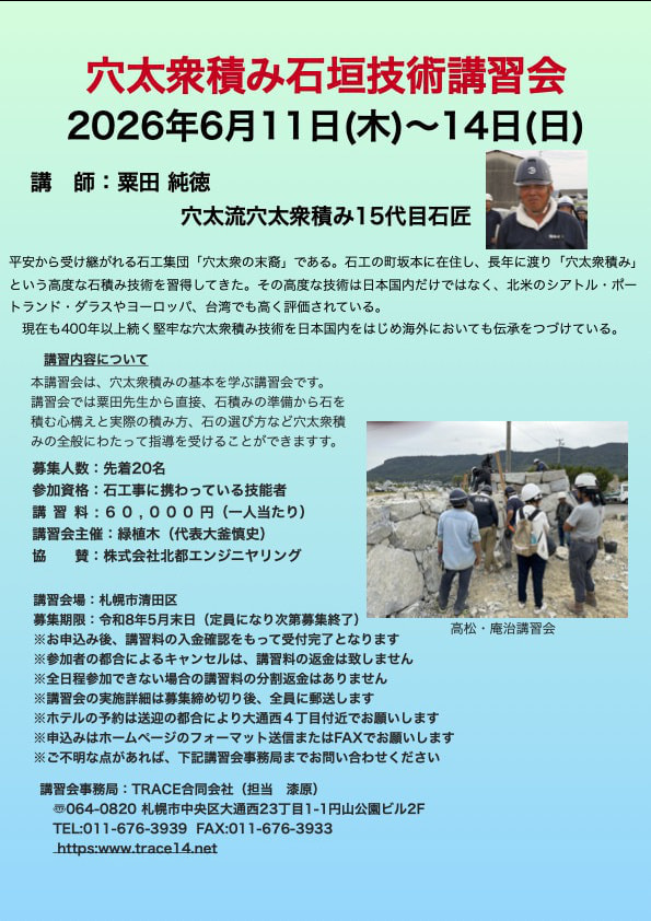 穴太衆積み石垣技術講習会を札幌で実施します。 講習会場は「緑植木作業工場(札幌市清田区)」です。 6月は札幌市内で各種イベントが計画されています。 ホテルの予約が取りづらくなることが予想されます。 参加される方は早めのホテル予約をお勧めします。